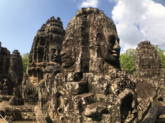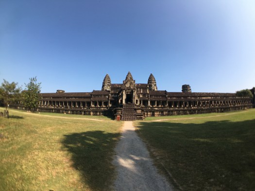 Angkor Wat. A huge, sandstone complex surrounded by a 620 foot wide moat. The moat serving an unusual purpose – keeping the clay foundation from drying out and collapsing the temple complex that sits on it. The temple contains 5 ornate towers shaped like lotus buds and its three levels rise majestically above the otherwise flat landscape. There is no doubt the engineering of Angkor Wat is an amazing feat. But from down here on the ground where it’s size and ornate towers are obscured it looks like a cement wall, nothing like the perfect aerial shots you picture when you think of Angkor Wat.